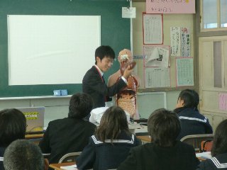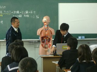 2年生の理科は、人体の仕組みについて、各器官ごとに学習をしています。今日のテーマは『排出』です。人間の体内から排出されるものは、固体、液体、気体とあります。その中でも、今日は液体で排出をさせる『腎臓』のお話でした。ここで登場したのが『マイク君』と名づけられているリアルな人体模型です。お腹の正面からは見えない腎臓を探して、胃や腸を外していくと、背中の方にソラマメに似た2つの腎臓がありました。小さな腎臓ですが、排出の大切な働きをしていることを、その後ICTの機械を使って説明していました。