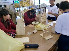 1年生の木工の授業です。本箱を作っていますが、作業進度には個人差が見られます。まだ木を切っている人、釘を打っている人、やすりをかける人。それぞれの段階ではありますが、どの生徒さんも真剣そのものです。すでに完成段階に到達した人は、目を細めてこれからの使い方に思いを馳せているようです。