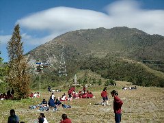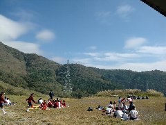 3合目でお昼ご飯をいただきました。ここから見える伊吹山を、パノラマ風に撮ってみました。急斜面の登山を終え、この開けた3合目にくると、安心感がわきます。反面、目の前にそびえる伊吹山の高さに、心が折れそうになった人もいました。