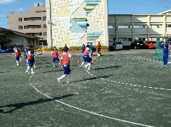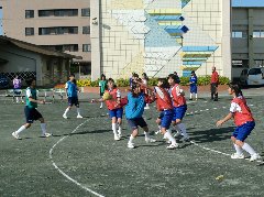 雨でぬかるんでいた運動場も徐々に乾きつつあります。今日は、市内中学校の女子ハンドボール部をお招きし、本校で練習試合を行っています。パスを回しながら、空いているスペースを見つけ、そこからシュートを打ちます。キーパーにとられないためには、スピードとコントロールが要求されます。体と体がぶつかり合う激しさがありますので、ボディーコントロールも身につける必要があるスポーツです。