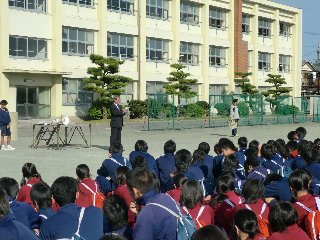 今日の午後はごみゼロ運動を行います。3年前より、町内11ヶ所に全校生徒が出掛けて掃除をする形になりました。小さい頃に遊んだお宮さんや遊園地に感謝の気持ちを持ってうかがいます。生徒会の皆さんの司会や、校長先生からご紹介いただいた近所の方の手紙の言葉を胸に出掛けていきました。