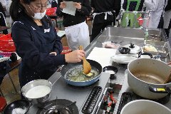 シチューについては、家庭で市販のルーを使って作ったこともあるようですが、調理実習は小麦粉から本格的に作ります。バターを溶かし、牛乳で小麦粉を溶かしながら焦がさないよう弱火で加熱して作ります。