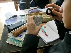 1年生の理科は、岩石の学習をしています。今日は火成岩とその鉱物を、実際にルーペで観察しスケッチをする授業を行っていました。