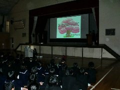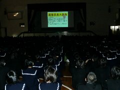 この集会は、3年生を送る会の説明会です。3年生の皆さんに喜んでもらえるように、思い出に残してもらえるようにと、生徒会の皆さんが在校生に呼びかけています。今日は、どんなことをやるのか、どんな係が必要なのか、どのような思いでやるべきなのかの説明です。歌う歌をかけたり、昨年の様子をスライドで紹介したりしていますので、皆とても真剣に受け止めてくれています。きっと、たくさんの人が実行委員に立候補してくれることでしょう。