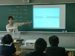 授業に、ICT機器が取り入れられて1年以上がたちます。教科によって差はありますが、使える場面では積極的に使われています。左側は、英語の授業です。以前は、フラッシュカードとして、紙に書いたものを使っていましたが、今はクリックをすると文字が変わっていくものを使って、皆で発音を確認しあっています。