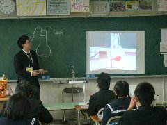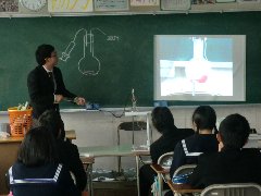 右の2つは、理科の実験です。フラスコの中の様子を見せるのに、実物では小さいため、実物投影機を使って拡大して紹介をしています。今日は、雲を作る実験です。スクリーンの中のフラスコが白く曇ると、『おっ!』と声が上がっていました。