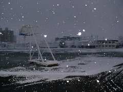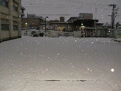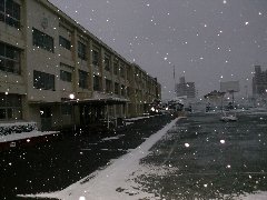 雪が降っています。道路の積雪はさほどではありませんが、通学の時間帯にかけて降り続くとの予報が出ています。人は止まれても、車が止まれないのが雪です。周りや足元に十分注意をして登校しましょう。また、靴下が濡れることも考えられますから、替えの靴下などを用意するとよいでしょう。では、気をつけて登校してください。写真は、朝の幻想的な学校の様子です。