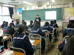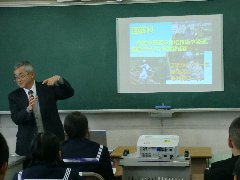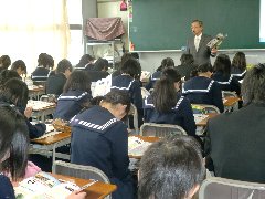 来ていただいている高等学校は、岐阜工業高等専門学校、稲沢高校、一宮高校ファッション創造科、木曽川高校、一宮興道高校、岩倉総合高校、一宮商業高校、起工業高校の8校です(順不同)。校長先生や教頭先生にも来ていただいて、写真のようにプレゼンテーションソフトを駆使したり、パンフレットを使ったりして、中学2年生の生徒の皆さんによく分かり、将来の選択肢になるようにと丁寧に説明をいただいています。
