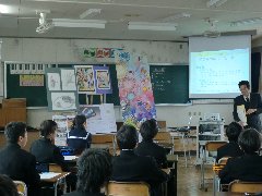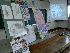 起工業高校のプレゼンテーションの様子です。特徴のある科が多く、生徒の皆さんも驚きの連続です。大きなパネルは、デザイン科の皆さんの作成したもの。白い線を自分で読み取って走行するコンピュータ制御の車など、すばらしい作品の連続です。そして校長先生から、工業高校の就職率がとてもよいとのお話や生徒さんの中に国体で優勝した生徒さんがいるなど、私たちの知らない話をいっぱいしていただきました。