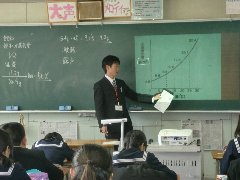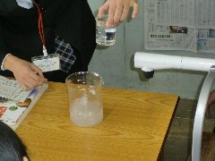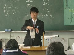 授業の終わり頃に、先生から「昨日の今頃何か降ったね?」との質問がありました。雹とか霰とか雪という答えが生徒の皆さんから出ました。正解は氷の塊の霰だったのですが、おもむろに先生が、「霰を教室で作ってみせましょう」と実験を始められました。仕組みはごく単純で、過冷却の水をつくり、そこに小さな氷の塊を凝結核として入れることでできあがります。突然、小さな氷が大きくなり、重くなって空から降ってくる。これが霰なんですね。生徒の皆さんが教卓の周りに集まり、じっとビーカーを覗き込みます。そこに小さな氷の塊を入れると・・・・「次の時間に、ビデオで紹介するね」で授業は終わりました。過冷却の水を作るには、時間が短すぎ、十分に冷えていなかったことが失敗の原因だったようです。「予備実験では成功していたのに。次の時間こそは」と、密かにリベンジを誓ってみえました。