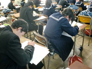3年生は、今週愛知県私立高等学校の一般入学試験が終わりました。今日の7時間目は、公立高等学校の受検校別に生徒の皆さんが集まり、願書の下書きを行っていました。先生のおっしゃるとおりに一字一句注意深く下書きを書いていました。緊張感いっぱいの教室でした。
