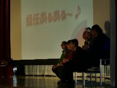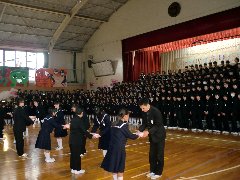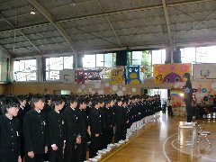 続いて、3年生の先生方からトークショーが開かれました。担任としての思い出や自分の中学校時代のこと。担任のクラスの生徒への一言メッセージなどが続きました。思い出のスライド(後半)をはさんで、メッセージカードや合唱の贈り物が後輩の皆さんからありました。後輩の「ありがとう」の合唱は、屋内運動を揺るがすほどの迫力がありました。歌詞や曲のすばらしさもありますが、歌う生徒の皆さんの熱意や思いが、屋内運動場と私たちの心を動かしたに違いありません。
