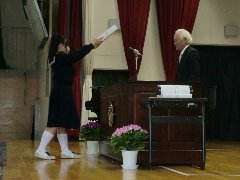 その後、代表生徒に同窓会記念品が授与されました。最後に、同窓会入会誓いの言葉を代表生徒が述べて会は終わりました。同窓会メンバーとしての、卒業生の皆さんの活躍に期待をします。