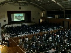 会は1年間の思い出を振り返るスライドから始まりました。桜が咲き誇る中を入学したこと、クラスマッチや美浜の宿泊学習。体育祭など、過ぎ去った1年間をなつかしく思い出していました。その後、代表者が、プレゼンテーションソフトを使って職業調べの内容を説明しました。保育士や公認会計士、水族館のスタッフなど多岐に渡った発表がなされました。「ありがとうの」の合唱の後、来年度へ向けての決意表明をして会が終わりました。