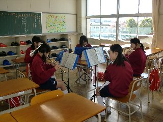 室内では、ブラスバンド部の皆さんが、パート練習をしていました。ここも、パートリーダーの声に合わせて自主的に練習を進めています。