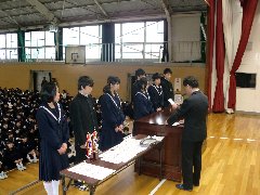 その後、市民ソフトテニス大会と、一宮市卓球大会の表彰を行いました。テニス大会では、TさんHさんペアが3位に入賞しました。卓球大会では、3年生女子の部でOさんが優勝、Mさんが5位に入賞、1・2年生男子の部でK君が5位に入賞しました。入賞した皆さん、おめでとうございます。