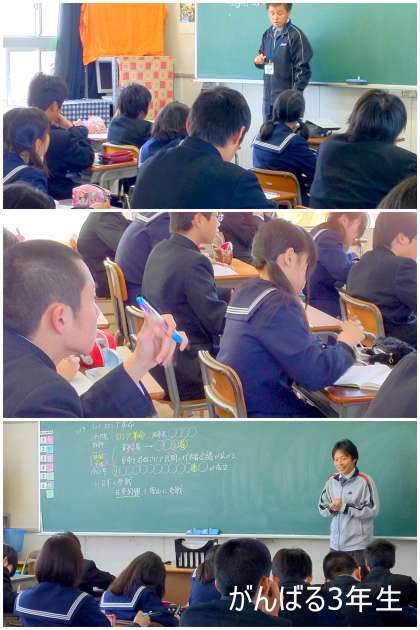 4月18日 2、3年生 授業の様子から 公開日 2012/04/18 更新日 2012/04/18 お知らせ 5時間目、給食後のこの時間帯は、ついつい集中力が切れそうになるころ。しかし、どの教室にも真剣さがあり、しっかりとしたまなざしで授業を受けていました。 特に3年生は、進路決定の日までの長い挑戦が始まっています。一日一時間を大切にしたい。そんな気持ちを感じさせる姿でした。がんばれ今中生! y