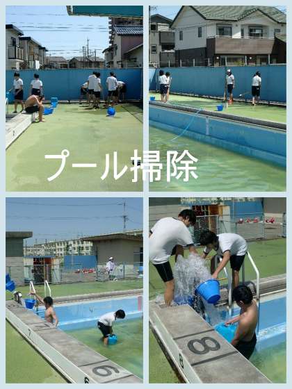 プールでは、水泳部の皆さんがプール掃除を行っています。ただ、排水装置に不具合があり、残り20cmぐらいの水が抜けません。修理を依頼することになりますが、それではプール開きに影響が出ます。人海戦術を展開することになるかもしれません。