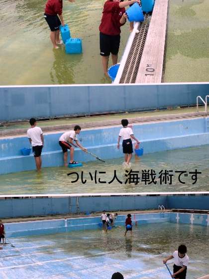 プール掃除も連続3日目。最後の水が抜けず、悪戦苦闘。やはりバケツで、少しずつでも水を搔き出すしかないのでしょうか。水泳部の皆さんありがとうございます。