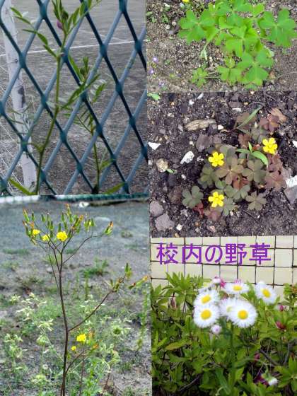 校地内の花壇は、いつも美しい花に覆われていますが、ちょっと目を転じ、草花を撮影してみました。カタバミは黄色の花を咲かせます。噛むとすっぱい味がします。ハルジオンはこの時期に花をつけ、ヒメジョオンはもう少し後に咲きます。この2つは名前も花の形もよく似ていて間違われることが多い花です。カラスノエンドウとスズメノエンドウも、花の大きさが違う程度で区別がつきにくい花です。エンドウといわれますがソラマメに近い種類です。