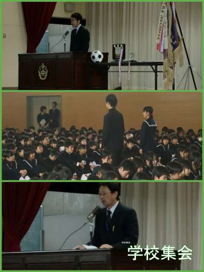 学校集会が行われました。今日は、新しい先生の紹介、表彰伝達、校長先生のお話が中心となりました。表彰は、サッカー部、ハンドボール部とソフトボール部の皆さんでした。おめでとうございます。