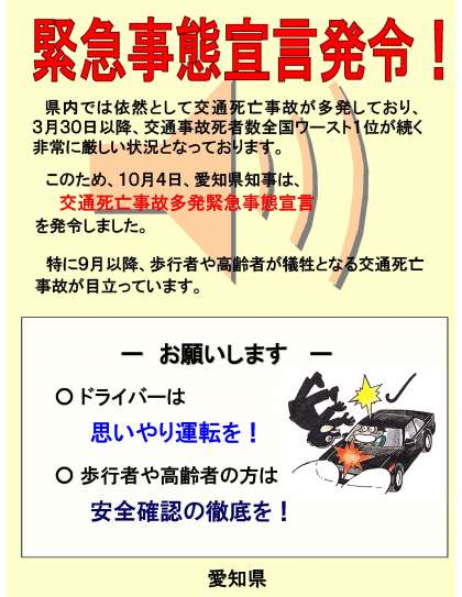 10月4日に愛知県知事から、「交通死亡事故多発緊急事態宣言」が発令されました。愛知県は3月30日以来、交通死亡者数全国ワースト1位が続いています。今回で5回目の緊急事態宣言が出されました。10月3日現在、愛知県では事故死者数が167人で昨年度に比べて11人の増加となるなど、交通事故による死亡者数に歯止めがかからない状況が続いています。