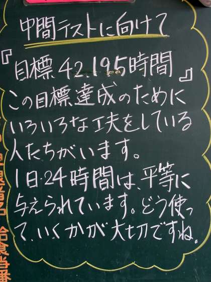 中間テストまで今日を入れて3日、17日からの2日間に向けて、みなさん、しっかりと学習に取り組んでいることと思います。