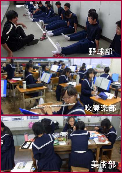 中間テストも終了し、今日の天気とは対照的に晴れ晴れとした表情の生徒のみなさん。久し振りの部活動に集中して取り組んでいます。あいにく、グランドの状態が悪いため、室内でのトレーニングをしている部活動、合唱コンクール当日の発表に向けた練習に取り組むブラスバンド部、それぞれの表現を楽しみながら取り組んでいる美術部など、校舎内でもしっかり活動ができていました。