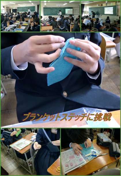 2年生の家庭科では、ペットボトルホルダーをつくっています。縫い方は「ブランケットステッチ」男女を問わず、手元に集中して縫い続けていました。
