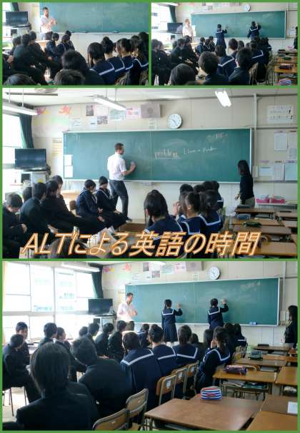 3年生の英語では、ALTの先生の指導のもと、ゲーム形式で単語や英文を黒板に書いていました。ただ書くのではなく、競争になっているため、どの生徒さんも楽しく授業に取り組んでいました。