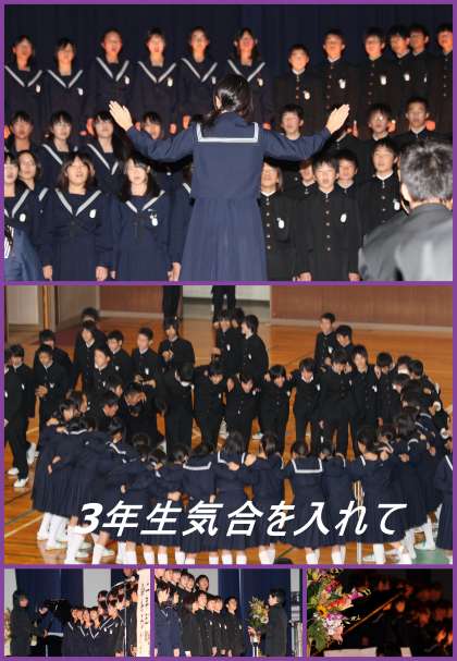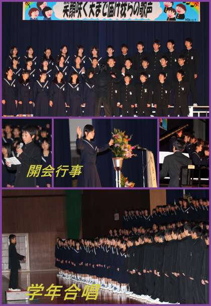 11月9日 合唱コンクール 公開日 2012/11/09 更新日 2012/11/09 お知らせ 会場にいる人全員に感動をくれた合唱コンクールが終わりました。今までの練習の苦しみ、焦り、トラブルが全て報われたのではないでしょうか。結果として「賞」があるクラスとないクラスになるのですが、目に見えない「賞」を全員が心に得た瞬間でもありました。感動をありがとう!