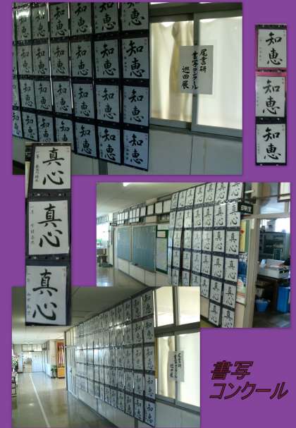 市内中学校の皆さんが夏休みに書いた書写の優秀作品を集めたものが、本校保健室前廊下に掲示されています。本校の皆さんだけでなく、他校の生徒の皆さんの作品も見ることができるため、放課には多くの人が集まっています。ワープロが全盛を極めている今、書道の持つ線のやわらかさ、力強さを愛する心を日本の文化の一つとして持ち続けたいものですね。