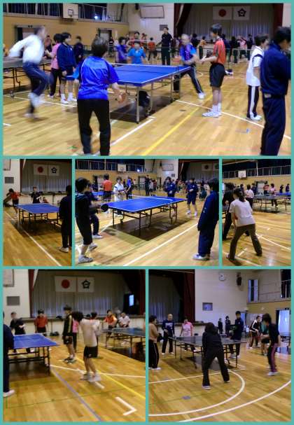 運動場では、グランドゴルフ大会が開かれています。昨日の雨が残っているのではないかと懸念されましたが、やや地面はやわらかいものの、水はけの良い運動場で無事大会を開くことができました。朝の冷たい風もやみ、柔らかい日差しに包まれており、時折歓声や笑い声が聞こえてきます。また屋内運動場では、卓球大会が開かれています。地域の方と一緒になってダブルスを組んで出場している生徒もいます。球のスピードや動きの違いに驚きながらも、協力して試合に臨んでいます。