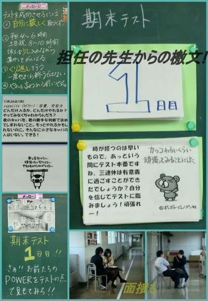 今日から期末テストが始まりました。皆さんそれぞれに気合を入れて登校しましたが、気合が入っているのは担任の先生も同じです。教室の後ろの黒板には、担任の先生からの檄文が書かれています。端的で明瞭に書く先生、丁寧に段階を踏んで指導を書く先生、伝えたいことをやんわりと書く先生。担任の先生の人柄が見えてきます。この檄文を読んで、生徒の皆さんもやる気になったことでしょう。
