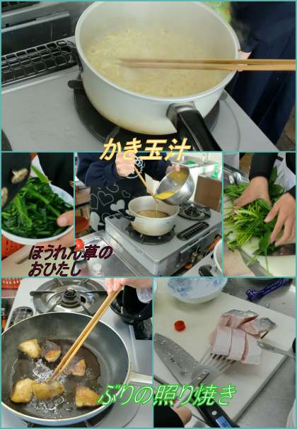 1年生2回目の調理実習が行われています。今回の料理は、「ぶりの照り焼き」「かき玉汁」「ほうれん草のおひたし」の3品です。中でもかき玉汁は、だしを鰹節でとるという、最近では、なかなか家庭でも行われていない本格的なものを実習しました。この学習を生かして、汁物や煮物を家庭でも作れると良いですね。