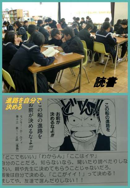 進路を決める季節がやってきました。今日は進路希望調査の用紙を担任の先生に出す日ですが、さまざまなドラマがあるようです。後悔のない、自分に最適の進路を選んで欲しいと思います。3年生の掲示板に、『自分で決める』の言葉がありました。まさにその通りです。保護者や先生の話に納得して、自分で決める。ここが大切だと思います。
