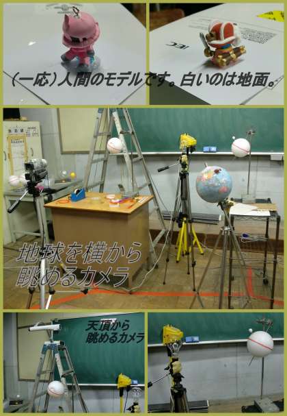 地球儀モデルを二つ用意し、地軸を傾けます。そして日本の位置にあたるところに人形を貼り付け、モデル太陽で照らします。この様子を、横から見るカメラと、天頂からのカメラ二つの映像で同時に観察します。すると一目瞭然。夏モデルは頭の真上から光が照らされ、昼間の時間が長くなります。この二つが夏暑い理由なんですね。大きな画面で、実際に地球が回っているかのように観察できるため、内容がとても理解しやすかったと思います。