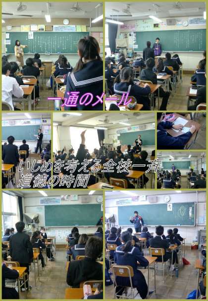 6限は、資料『一通のメール』を使って全校一斉に道徳の時間がもたれました。友達が言ったことを真に受けて親友を失いかける話です。最近は、携帯電話を持つ生徒の皆さんが増えたため、とても身近に感じられる内容だったのではないでしょうか。軽い気持ちで打ったたった一通のメールが大きな問題を引き起こしました。