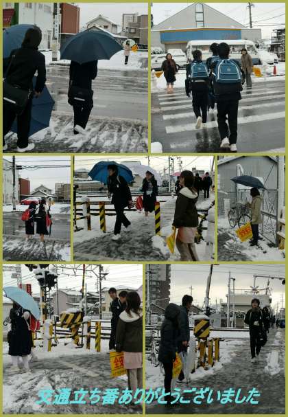 こんな雪が降り続く悪天候の中でしたが、PTA学級委員の皆様には早朝より交通立ち番指導に参加いただきありがとうございました。おかげさまをもちまして、雪による事故けがもなく、生徒の皆さんは安全に登校をすることができました。雪が降り続いています。午後からは、予定通り保護者会を行いますので、保護者の皆様も交通安全には十分ご留意いただいてお越しください。