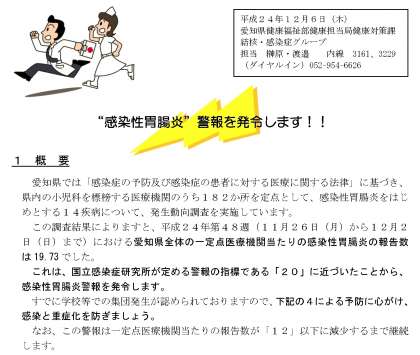 愛知県に「感染性胃腸炎警報」が発令されました。「感染性胃腸炎」はウイルス、細菌、寄生虫などによって引き起こされる胃腸の疾患で、1年を通じて発生がありますが、例年、秋から冬にかけてノロウイルスをはじめとするウイルスによるものが多く発生します。症状は原因となる病原体により異なりますが、発熱、下痢(水様便、血便など)、悪心、嘔吐、腹痛などが見られ、これらの症状が単独または、複数の症状が様々な組み合わせで現れます。