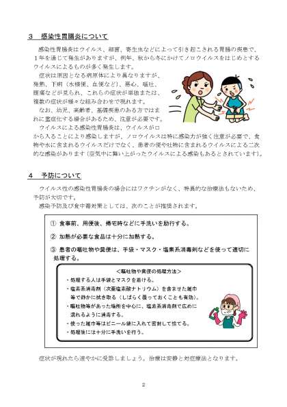 ウイルス性の感染性胃腸炎の場合にはワクチンがなく、特異的な治療法もないため、予防が大切です。