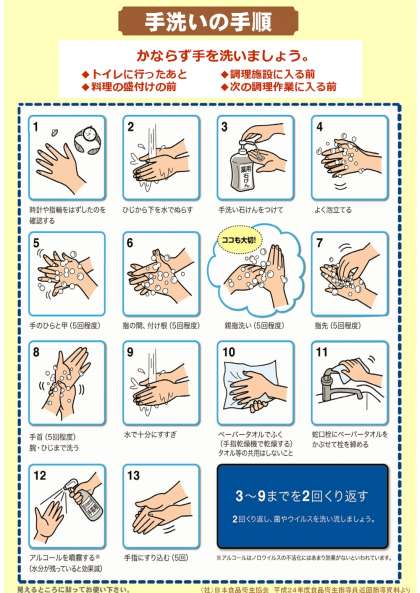 1 食事前、用便後、帰宅時などに手洗いを励行する。
