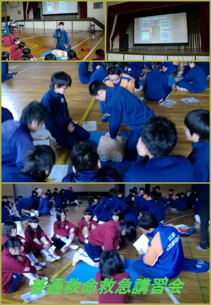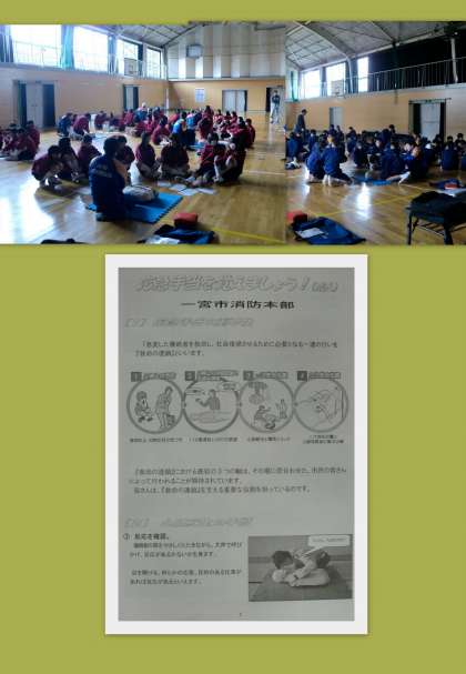 一宮消防署の署員の皆様にご来校いただき、屋内運動場を会場に普通救命救急講習会が開かれています。対象は2年生ですが、生徒数が多いので、今日の午前中に3クラス、午後2クラス。明日の午前中に2クラスを実施します。