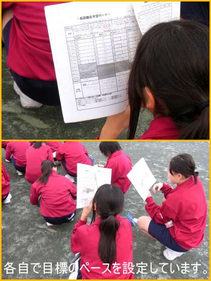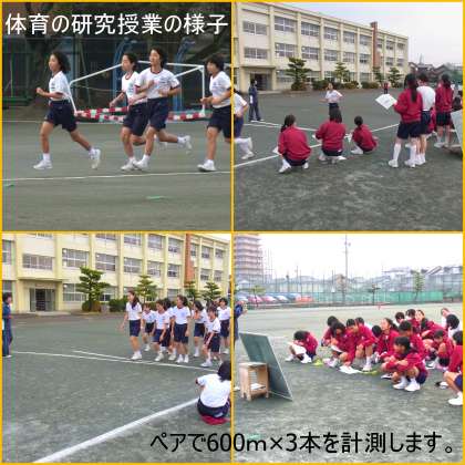 1時間目、1年生の体育は、2クラス合同の「陸上競技」(長距離走)でした。7時間の授業構成の最後の授業では、1400m走の計測があります。それに向けて、正しい走り方を身につけ、タイムを縮めるために、600mペース走の練習に取り組みました。ペアで記録をとり合い、アドバイスや励ましをしながら、記録更新に向けてがんばっています。