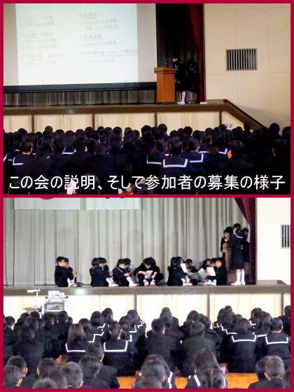12月20日 三送会オリエンテーションから 公開日 2012/12/20 更新日 2012/12/20 お知らせ 寒い朝です。今日は1,2年生全員が生徒会主催の三送会オリエンテーションに参加しました。生徒会の説明と募集内容を聞き、各学級の代議員が希望を集約します。卒業していく先輩たちのために、後輩として最後のプレゼントがしっかりとできるといいですね。