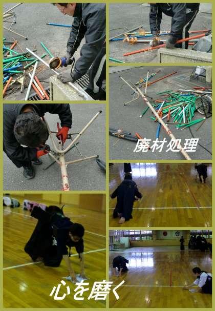 今日は金属の粗大ごみを、ディスクグラインダで切断して捨てました。また、武道館では剣道部の皆さんがこの寒さの中ぞうきんがけを行っていました。物を片付けたり、美しくしたりしながら自分の心も磨いているようです。