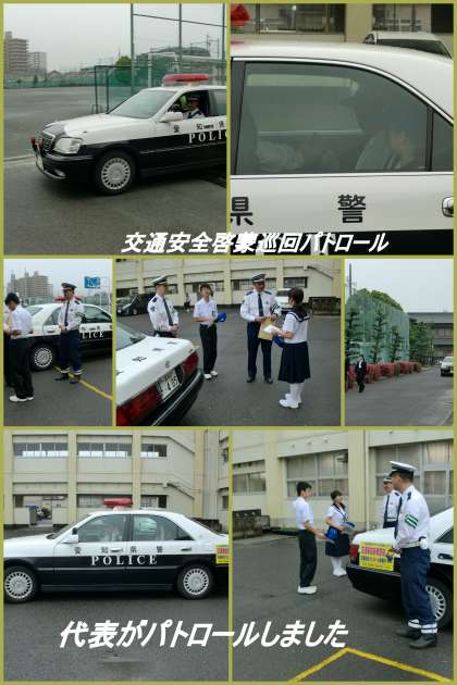 学校周辺の通学路をパトカーが通り、その中に乗っている代表生徒から交通安全が呼びかけられました。呼びかけは、対生徒だけでなく一般の方々にも及びました。
