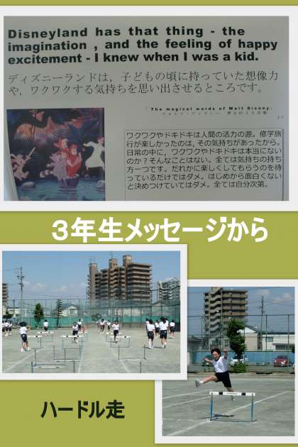6月4日 授業から 公開日 2013/06/04 更新日 2013/06/04 お知らせ 1年生の体育、女児はハードル、男子は走り幅跳びを行っています。どちらも、ただ単に走るのではないだけに、タイミングや、体のバランスが難しい競技です。室内では、バレーボールに跳び箱。ただ、どのクラスも、自分の種目に一生懸命なところがすばらしいですね。 3年生の廊下メッセージをアップしました。
