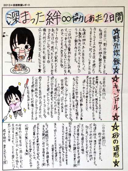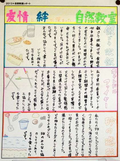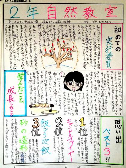 2年生の廊下掲示では、先日の「自然教室」で学んだことを、レポートにまとめています。一人ひとりの心に残ったできごと。イラストと文章表現を工夫して、アイデアいっぱいにまとめています。