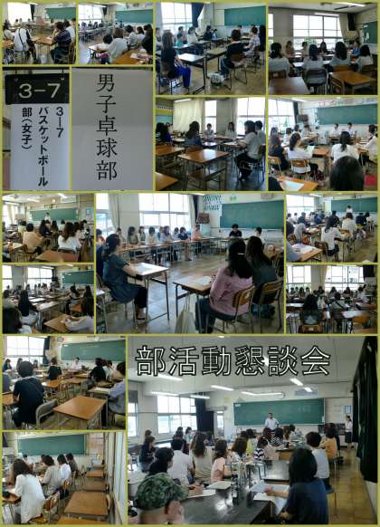 6月8日 部活動懇談会 公開日 2013/06/08 更新日 2013/06/08 お知らせ 授業公開を終えた5限は部活動懇談会になっています。特に1年生の保護者様にとっては、初めての部活動になります。顧問から詳しい部活動の活動方針などを聞き、今後の活動の参考にしていただきたいと思います。懇談会の後は、実際の活動の様子を観察していただきます。